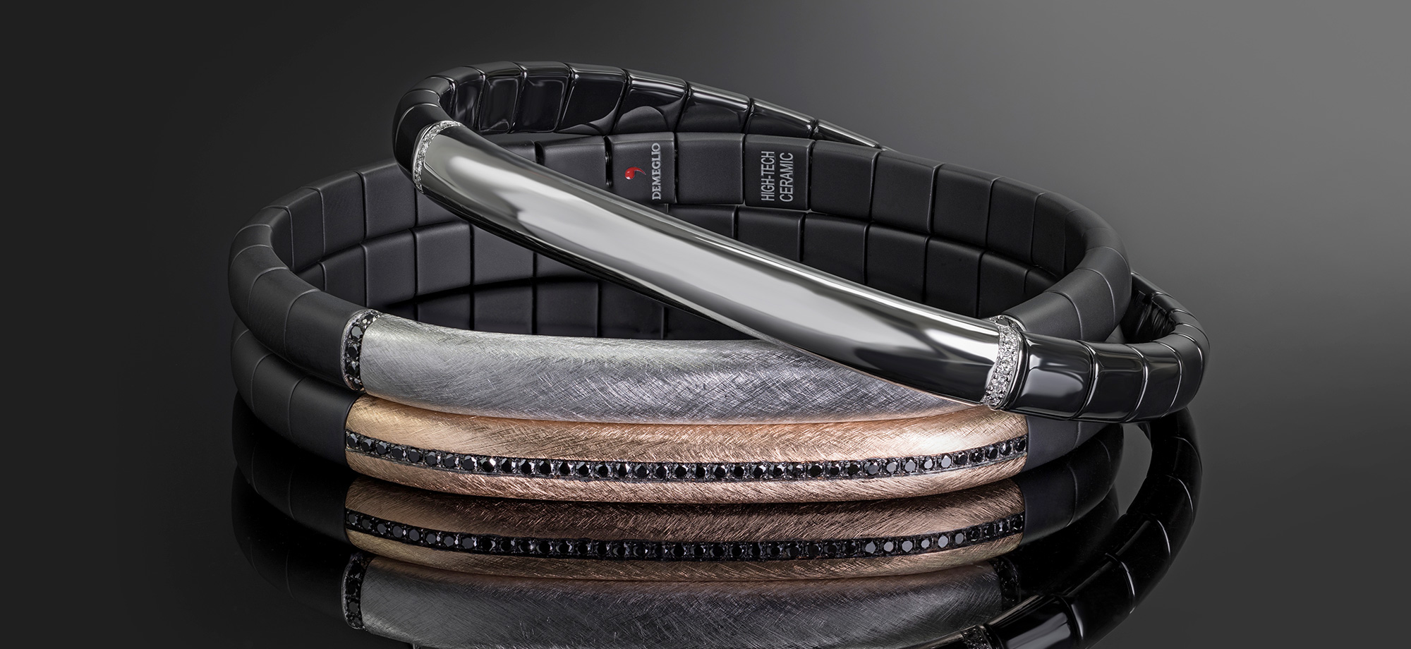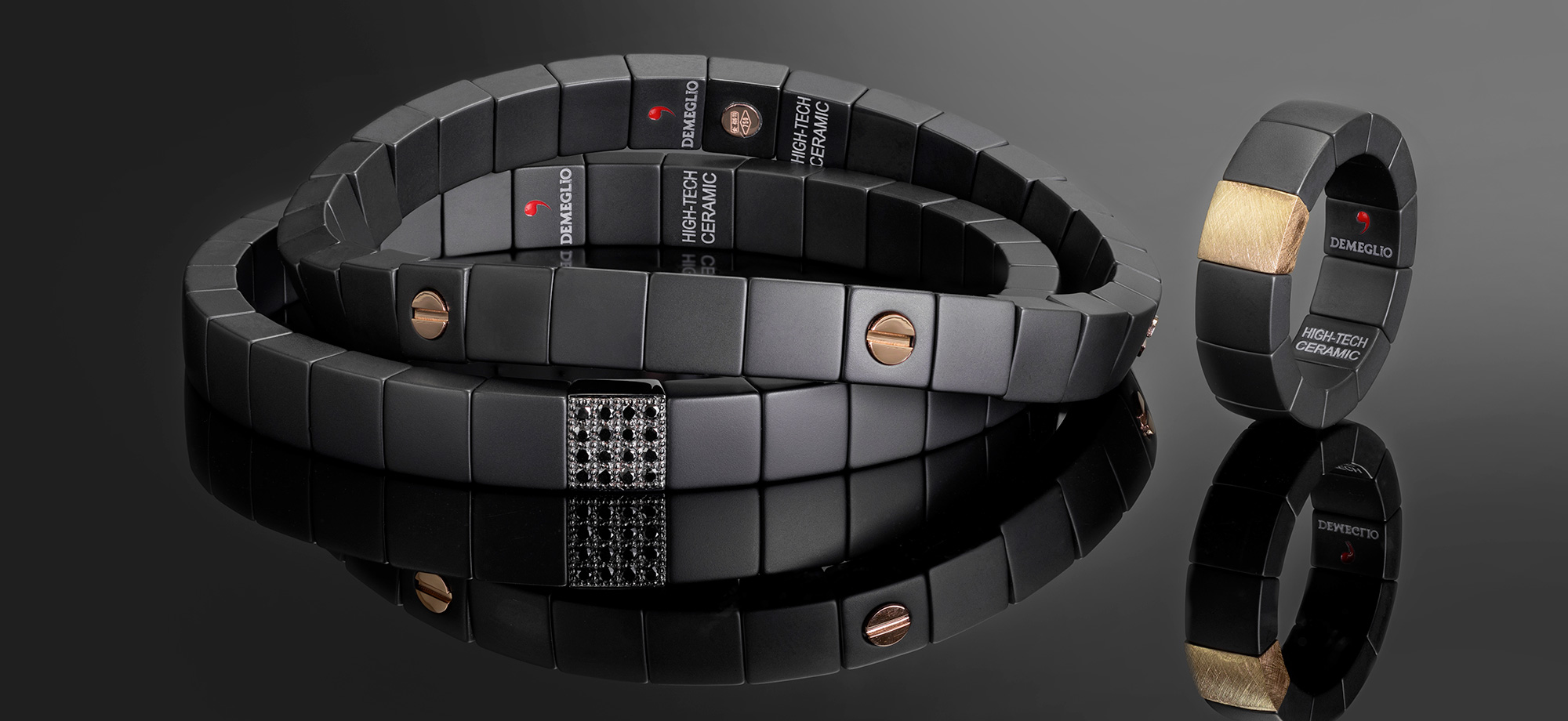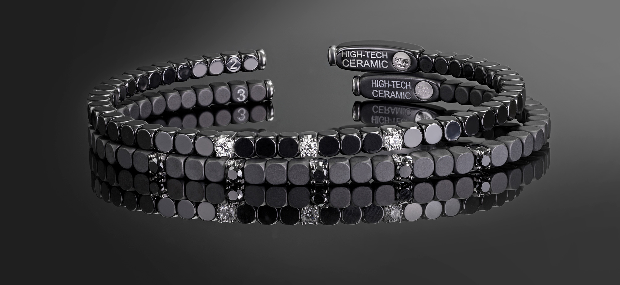 Bracciale pura grande luce in ceramica nera lucida con 7 elemento luce diamanti bianchi oro bianco alternati misura uomo