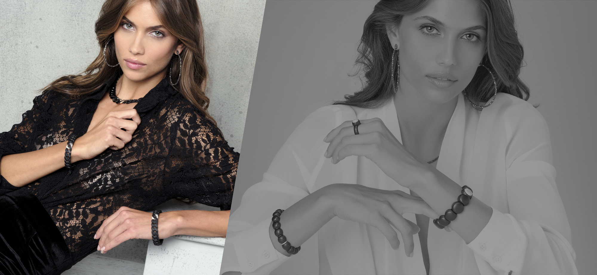 Bracciale pura grande luce in ceramica nera lucida con 7 elemento luce diamanti bianchi oro bianco alternati.