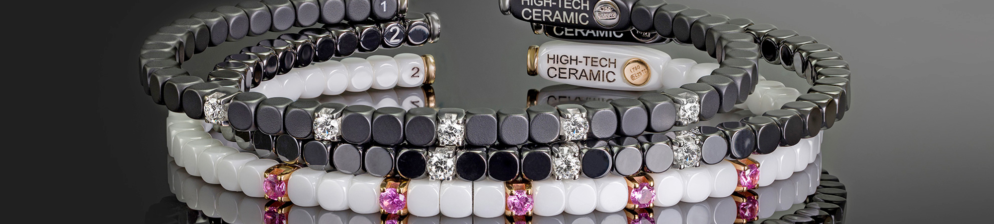 Bracciale dado in ceramica nera lucida con 9 dadi rubini oro rosa mis 1