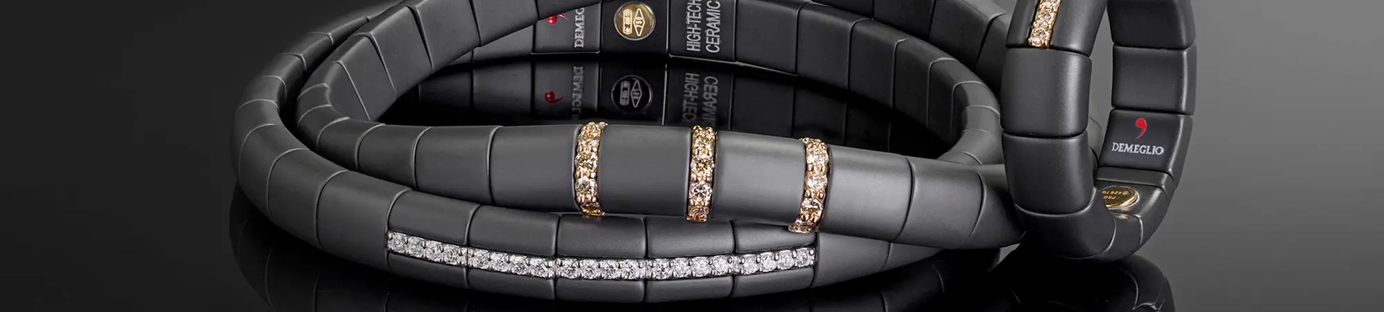Bracciale pura grande luce in ceramica nera lucida con 7 elemento luce diamanti bianchi oro bianco alternati.